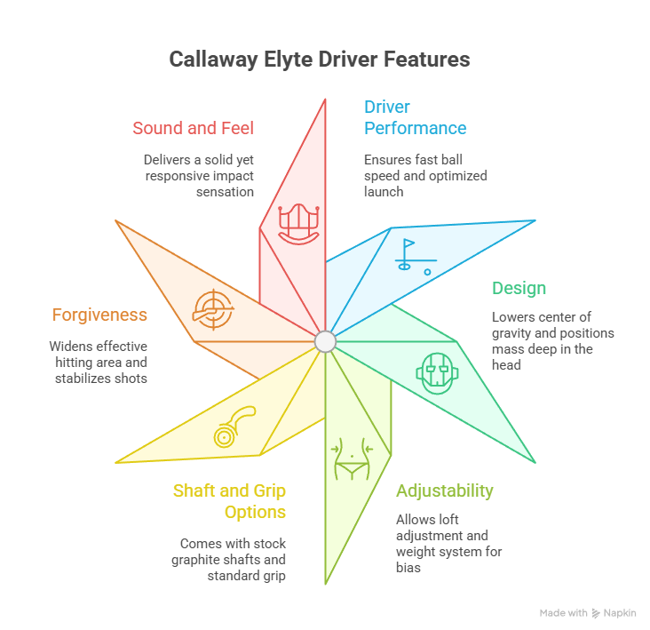 Reviewers highlight the Callaway Elyte Driver’s features as core design elements delivering speed, forgiveness, and shot‑shape flexibility.