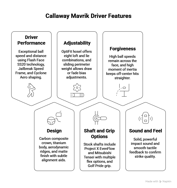 Adjustable perimeter weight settings give golfers a way to tune draw or fade traits to match specific swing needs. Feedback from the Mavrik driver review highlights a powerful sound and solid feel at impact that pairs with a high launch for longer carry.