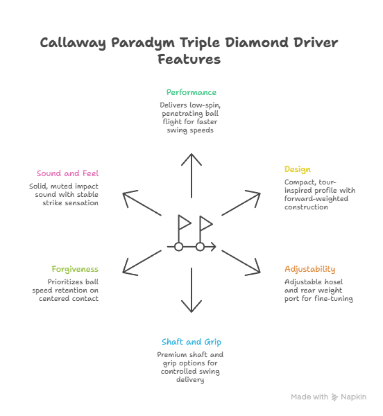 - Design: The Callaway Paradym Triple Diamond Driver uses a compact, tour-inspired profile with a forward-weighted construction. The carbon chassis shifts discretionary mass toward the perimeter and forward sections of the head to support stability and spin control.
