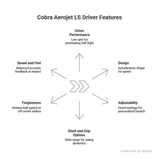 The features of the Cobra Aerojet LS include forward‑biased weight placement, aerodynamic shaping, adjustable loft settings, and a low‑spin face profile that support controlled launch and speed.