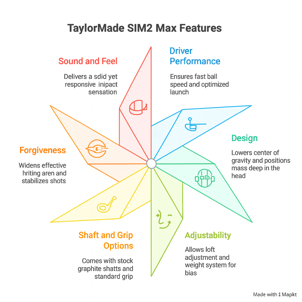 The TaylorMade SIM2 Max Driver is known for its forgiving design, high launch, and exceptional distance, and incorporates advanced technologies (low, forward center of gravity, a large sweet spot, streamlined clubhead shape).