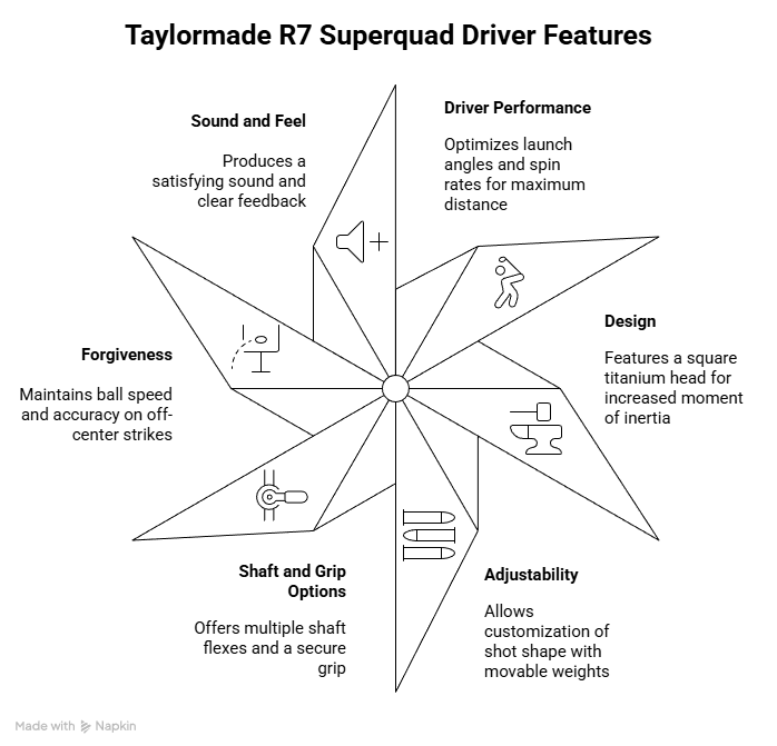 The features of TaylorMade R7 Superquad focus on adjustable weight technology and face engineering that support customization and consistency.
